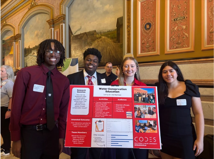 We have conducted almost two years of research about this wicked problem: the water equity issue. We have interviewed local educators and organizations, surveyed over 200 educators regarding their part in water conservation education, and learned from SIUE’s own STEM Center faculty about what it takes to develop lesson plans. The emerging themes were lack of awareness, lack of funding, and outstanding curriculum requirements, all preventing educators from implementing water conservation into their classrooms. Therefore, we visited the Illinois State Capitol, where we spoke with legislators about our findings. We decided to tackle after-school programming, which has fewer regulations. Read further to learn about the steps we took to orchestrate our very own water fair!Marques Rutlin, Justin Richerson, Payton Plummer, & Alexandra Guerrero at the Illinois State Capitol
