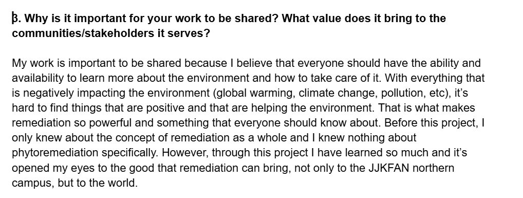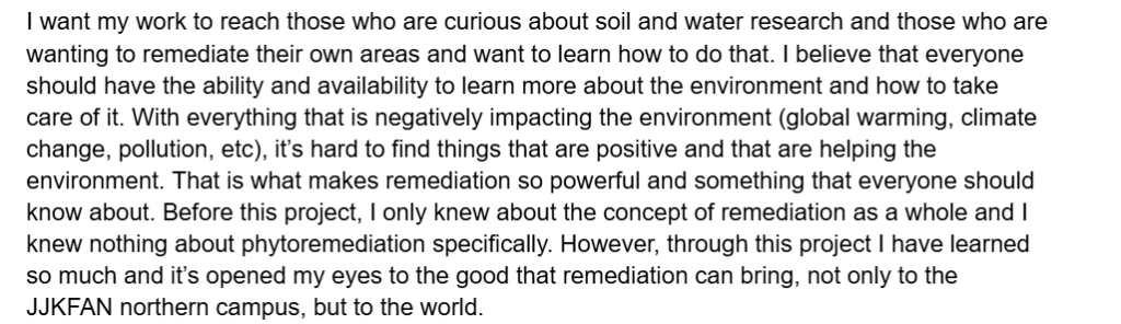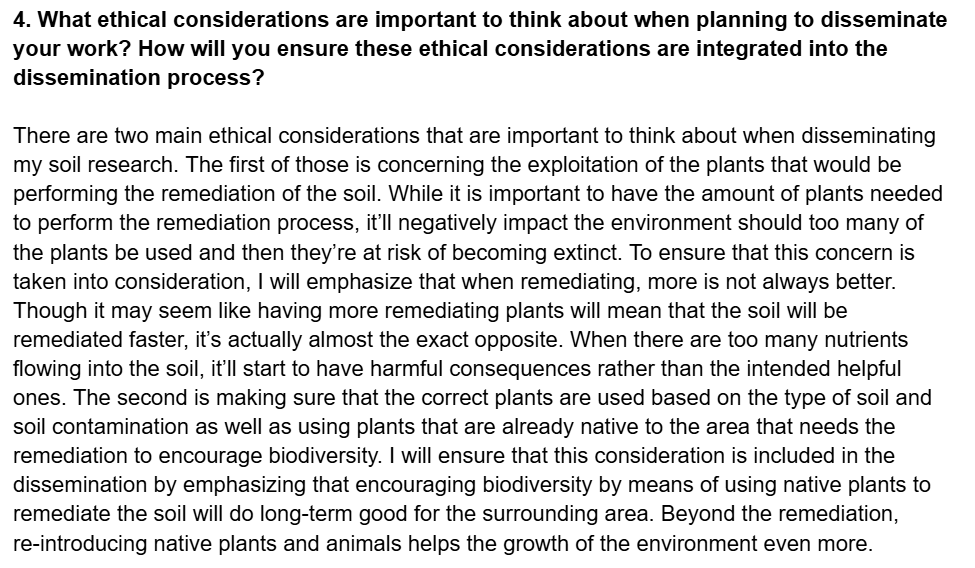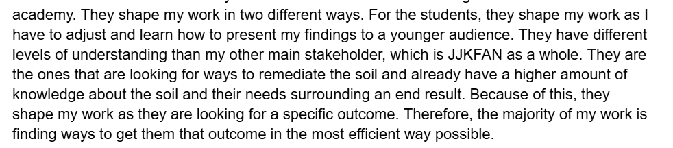 This is an excerpt from my Reflection #2 where I talk about the two stakeholders of my soil research. This shows that I understand the different perspectives that my work will be viewed from and therefore also understand the need for multiple avenues of understanding and usage required.