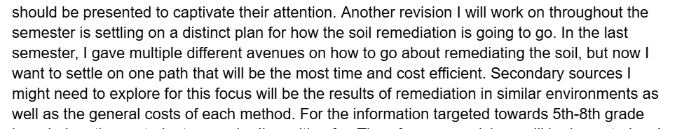 My goals for this semester are to focus on my organization skills as well as my writing skills as we continue to complete and assemble the final products of the work we’ve done over the past semesters. My hope is that throughout the semester I will learn more about how to compile data and research into one cohesive project as well as how to present that to stakeholders and other contributors. One thing I am excited for this semester is getting to see all of my group and I’s work together and one thing that I am nervous for is keeping up with the time management and overall work ethic that is required to go along with that. I do believe however that I will be able to overcome those challenges and still be able to have a good and cohesive product.