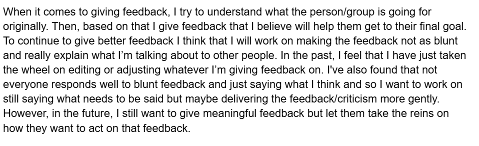 This is an excerpt from my Reflection #3 where I speak about how I give feedback to others. This demonstrates how I am able to look back upon myself, acknowledge areas in which I need to improve and do both of those in a reflective writing manner.