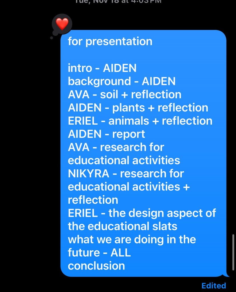 This is an image of a message from the groupchat we share as a team. I sent out this message so that everyone knew which part of the final project they were to complete so that it would all get done on time for the presentation. I also did this for myself so that I knew which of the part I was to focus on.