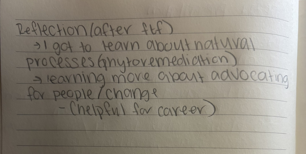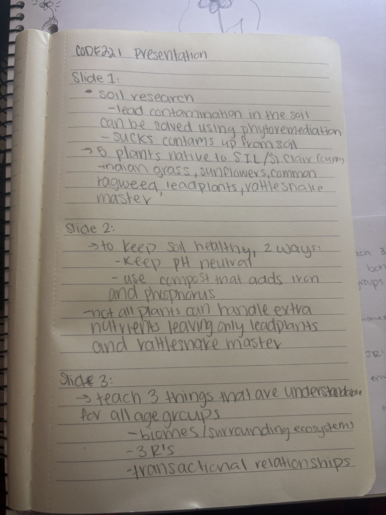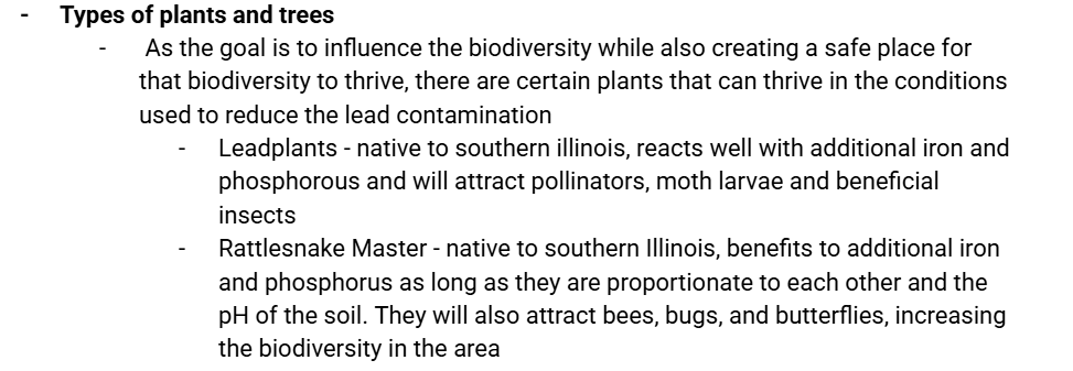 These are some of my research notes from the beginning of my project with JJKFAN and working to break down the lead poisoning within the soil. This shows my thought process when it comes to finding solutions to the bigger problem at hand considering a lot of the project depends on planting new trees/plants and encouraging the ecosystem to thrive.