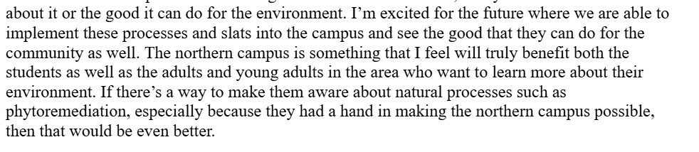 This is an excerpt from my data collection. Since I wasn’t fully aware of the type of soil that was going to be on the northern campus, I focused on the plants that are native to the area so that I could give JJKFAN options. In addition, I also added in the benefits of each plant that were capable of phytoremediation.