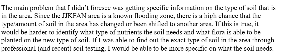 This is an excerpt from my Reflection #4 explaining one of the problems I was running into when trying to nail down specifcs for what to recommend for JJKFAN to do about the lead contamination in their soil. Even through this, I was able to give multiple solutions and avenues that would allow myself or another person working on the project to gain more information on the topic.