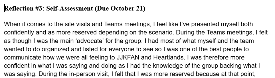 This is an excerpt from my Reflection #3 which was done after the site visit to JJKFAN. This was an important reflection because it was based on my current feelings and emotions surrounding how I felt I was doing during the site visits. It’s because of this that I amde sure I did the assignment as soon as possible.