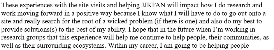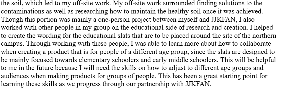 Throughout this semester, I’ve been able to learn a lot more about our project and what all I can do and have been doing to contribute to it. At the beginning, I was worried about if I would be able to find something for me to individually contribute since there wasn’t as much of a ‘group goal’ as there had been in previous classes. However, I was able to find something that I both enjoyed and was able to find a lot of information that is useful to JJKFAN and what they hope to achieve with the northern campus. In future courses, I would like to continue focusing on my goal surrounding coming up with diverse solutions to problems. My strategies to continue developing this goal are to keep researching on how people in the past have solved similar problems and observing how they worked (or didn’t work) and try to implement that into my project as well.