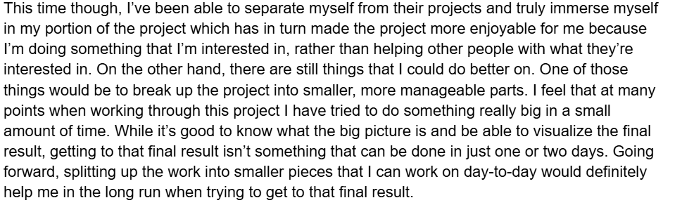 This is an excerpt from my Reflection #5 where I reflected on all the work I had done throughout the semester. This part is explaining the off-site work and how it will help me in my future. By explaining this, it will help people who are trying to understand why I specifically picked the part of the project that I did.