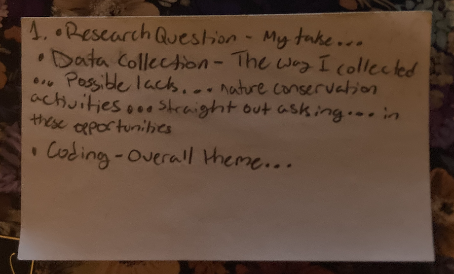While creating my interview questions, I put effort into making sure that they were as open-ended as possible while also making them inclusive to the diverse population on campus. In the questions I don’t assume their knowledge of nature conservation, but I also explained to them when asked ensuring them it was a safe space for questions.