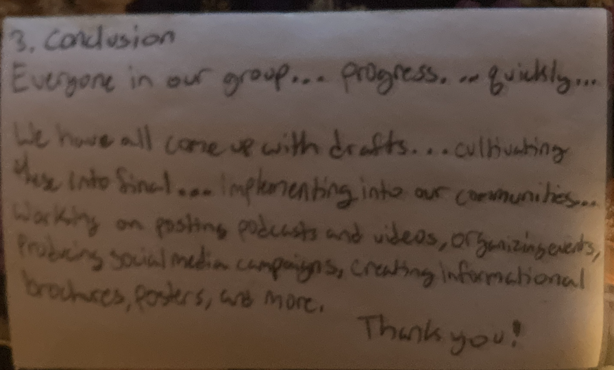 These note cards are organized in a way where I can just glance at them if I am feeling lost with my presentation. The slides have the points I’m making and the cards have the words that I will be using while speaking to the audience. That way if I happen to forget the specfic way I planned to start that sentence or a certain word I wanted to use, I could just look down and see the next phrase that I followed the previous one.