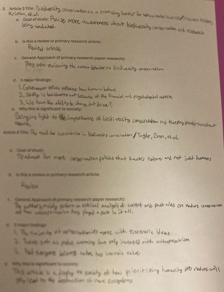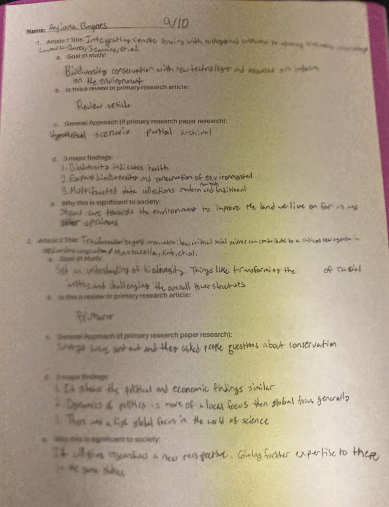 For this artifact, I had to confer with members in my paper’s group to come to a conclusion of what this article was about, as well as what the biggest takeaways were. After compromising on those responses, I then had to join groups with members doing the remaining papers. During this time, I listened to their explanations of their papers and wrote down the responses that came along with it. This allowed for me to understand the articles I hadn’t physically read and answer the questions that followed. I received feedback on my rubric indicating I completed A-level work.