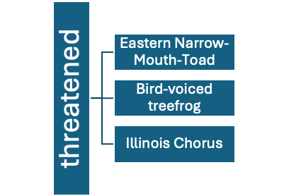 I collected data on animals by researching the key things they need to survive and thrive in their natural habitats. First, I chose which animals I wanted to focus on, and then I went deeper into their habits, environments, and the challenges they face. I decided to focus on frogs in southern Illinois because they play an important role in the ecosystem, but many of them are experiencing serious declines. Some frog species in this region are considered threatened, meaning their populations are dropping and they could eventually disappear if their habitats keep getting damaged. This usually happens because of habitat loss, pollution, and environmental changes caused by human activity. Three of the most threatened frog species in southern Illinois are the Illinois Chorus Frog, the Bird-voiced Treefrog, and the Eastern Narrow mouthed Toad. The Illinois Chorus Frog lives in sandy prairies and relies on temporary ponds for breeding, but these areas are shrinking due to farming and land development. The Bird-voiced Treefrog depends on forested wetlands and cypress swamps, which are disappearing as more land is cleared. The Eastern Narrow-mouthed Toad needs moist environments and spends most of its time under logs or leaf litter, but it struggles to survive when wetlands are drained or destroyed. While doing this research, I learned just how fragile these species really are and how closely their survival depends on healthy environments. Understanding their needs such as clean water, safe breeding spaces, and natural food sources helps us figure out how to protect them. This project made me realize that studying animals is not just about gathering facts. It is about seeing how everything in nature is connected. Protecting frogs means protecting the balance of their entire ecosystem, and that helped me understand why conservation work is so important.