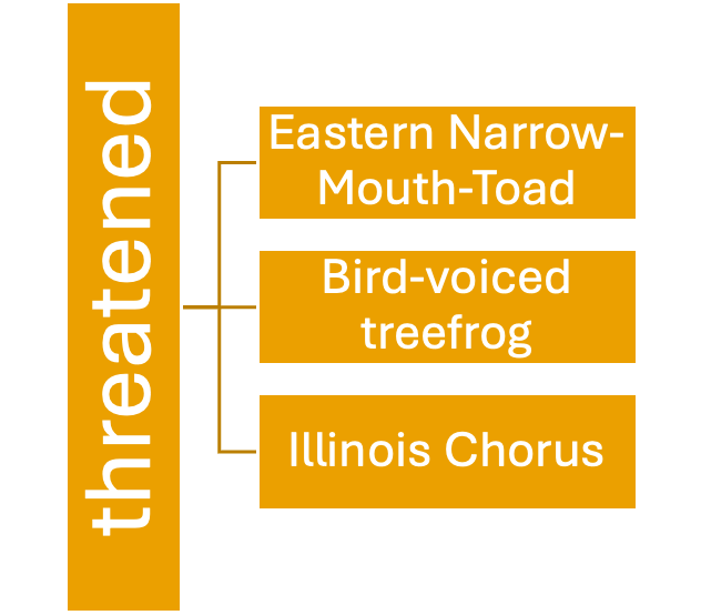 For my first semester animal research project, I looked at a bunch of species found in southern Illinois, learning about their habitats, diets, whether they’re native or invasive, and the pros and cons of each. Some of the animals I studied include salamanders, dragonflies, opossums, white-tailed deer, wild turkeys, black bears, ground squirrels, raccoons, groundhogs, coyotes, cardinals, hummingbirds, tree frogs, blue jays, red-tailed hawks, and striped skunks. After comparing my research with my team, I decided to focus on three threatened amphibians: the Eastern Narrow-Mouth Toad, the Bird-Voiced Treefrog, and the Illinois Chorus Frog. The goal of this project was to figure out which animals would best fit for our plan, and now that I’m sharing this with the JJK, the plan can move forward and succeed
