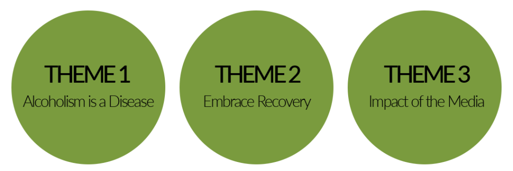 My analysis of data revealed that rebranding alcoholism as mediating both intimate communal services and the larger context of global communication in which alcoholism is discussed allows for the reorientation language and literary discourse across alcoholism and recovery. As a result, I concluded my data analysis with three educational-driven theoretical themes: alcoholism is a disease, embrace recovery (be proud of your sobriety), the media must change the landscape [Figure 6].