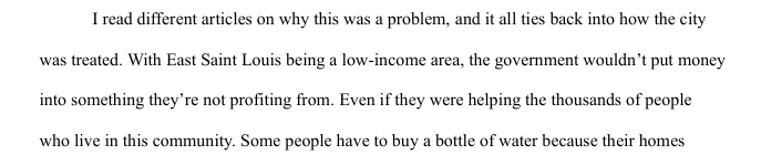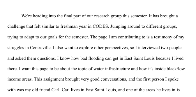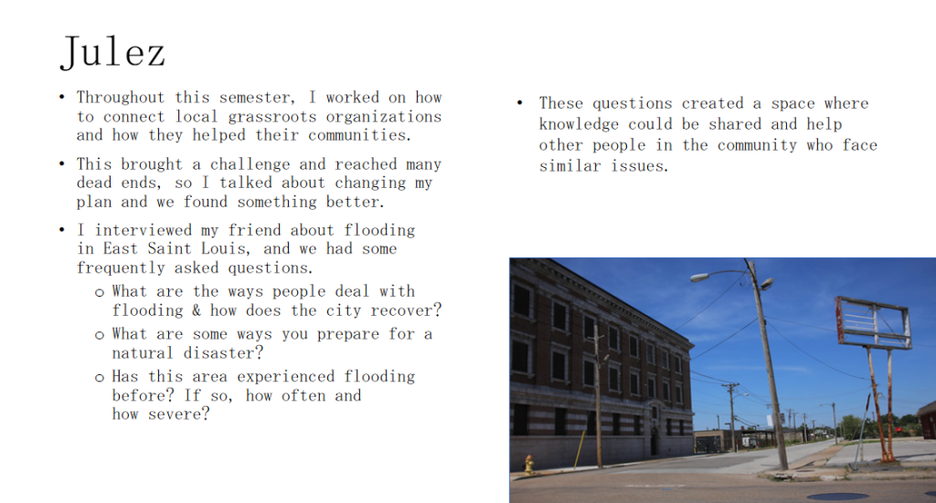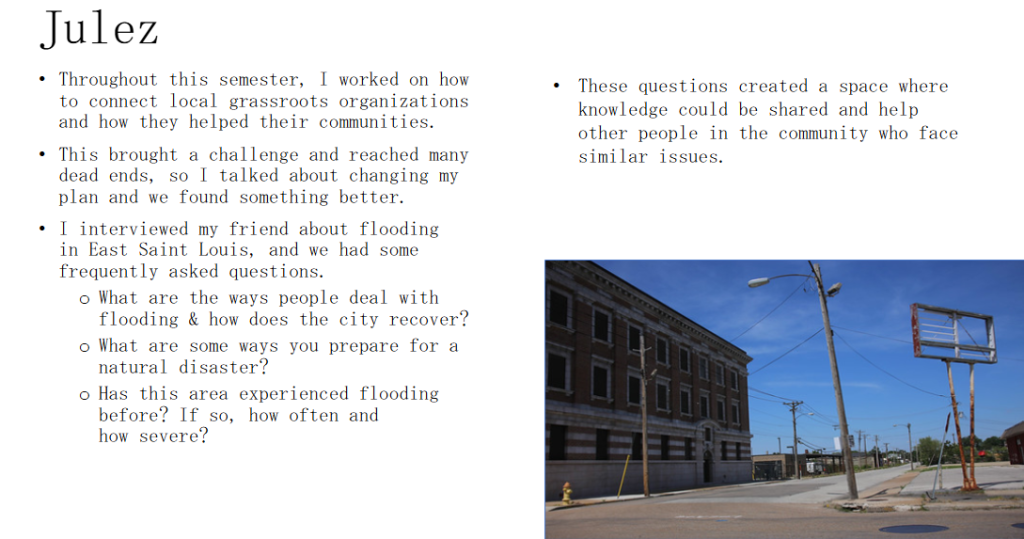 I am using this as evidence because I was able to go over my presentation before next week, breaking down my message. I was able to give an understanding of the firsthand experience of living in East Saint Louis. I acknowledge the struggles of the city because I grew up there, and I allowed the voices of people I interviewed to be shared. Giving future and potential advice for those who struggle or have dealt with flooding. This is evidence because the message I brought forward when speaking.