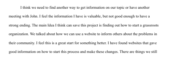 I am using this as evidence because I know the limits we went to find information on grassroot organizations. I have switched my groups for the 3rd time, and I was able to find my place with my current group. Coming up with a plan that would advance my progress and understanding of our mission.