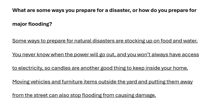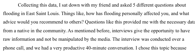 I am using this as evidence because of the different process I went through to gather data. First my thoughts were to go to different grassroot organizations helping during flooding but that didn’t work. My final though was doing testimony from people native to the city to give a firsthand perspective. proving that I found a creative way to show knowledge.