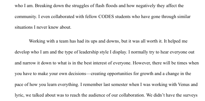 CODES is coming to a close, and I can honestly say that it is one of my hardest classes of the semester. I was lost for the majority of the semester and kept reaching dead ends. I talked to my professor about one of my ideas, and it was something possible we could do before the semester ended. Instead of just sharing my struggles with flood, I did interviews to give multiple responses and perspectives on flooding. The test presentation went well, and I believe our group will ace the next upcoming challenge. I feel everything turned around and worked in my favor. I had some challenging moments, but I was able to endure them all.