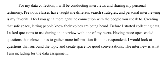 This is used as evidence because I found a solution to getting data that’s useful or relevant to our topic. Interviewing people rather than just writing about my own personal experience can give multiple perspectives.