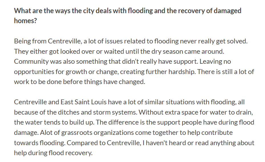 I’m using this as evidence because I have addressed and found the main factor of flooding. Researching to understand why water infrastructure is so strong in Cahokia Heights and East Saint Louis. Considering this, people are still battling issues inside and outside their homes.