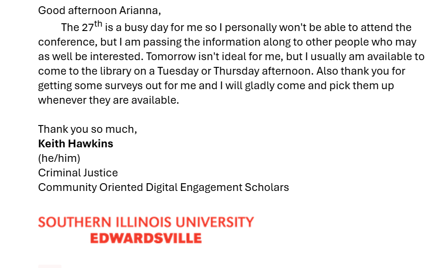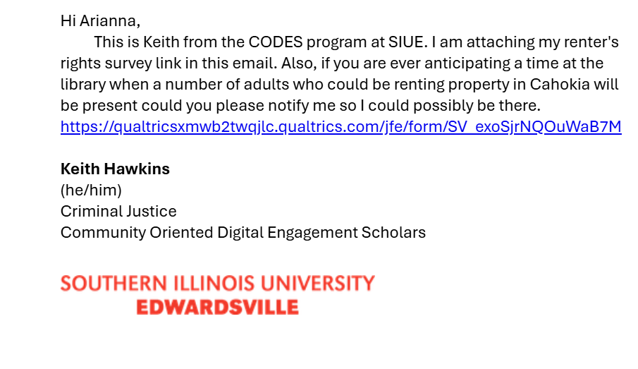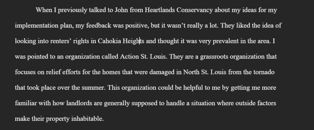 I am about halfway through the semester and my plans for the course have changed slightly but I am still headed in the right direction. Initially I planned on conducting more interviews along with my surveys, but it doesn’t look like I will be having enough time to prepare, conduct, and transcribe interviews. However, I have gotten a handful of responses for my renter’s rights survey. So far, I have done a lot of communication between community partners, specifically with Arianna from the Cahokia Public Library.