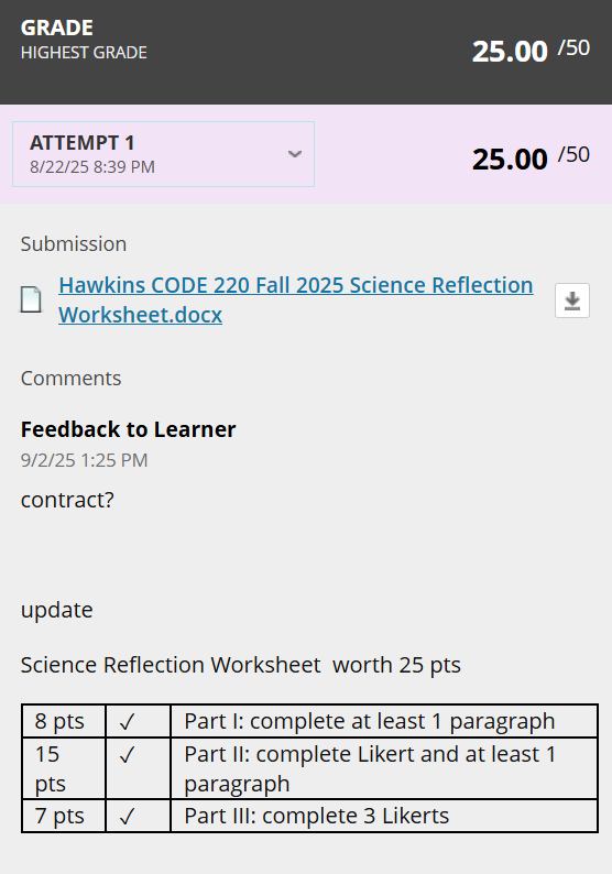 | (25%) Based on (12C) Collaboration: Works independently toward goals by contributing and meeting deadlines. | Make sure to turn assignments in by the assigned due date | Choose 5 different reflections that are submitted by the original due date | The Reflections that are displayed should score at least 80% and be completed on time and meet all writing requirements |
