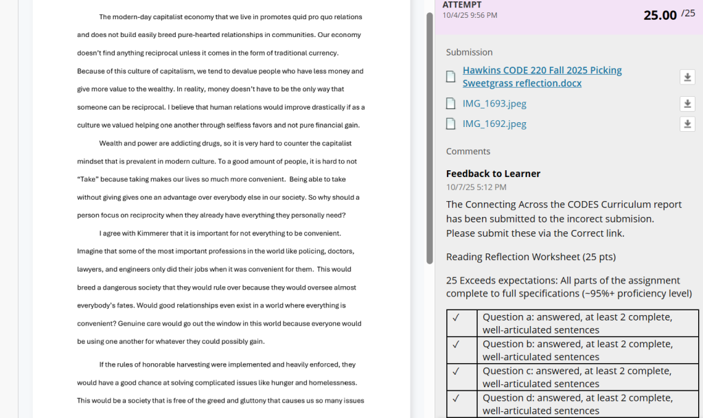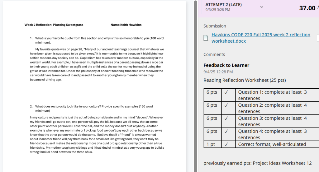 Artifacts above are screenshots of reflections over Braiding Sweetgrass sections and a grade of a pop quiz over Braiding Sweetgrass. I scored over a 100% proficiency on all of the artifacts. The book Braiding Sweetgrass discusses heavily about indigenous cultures and their practices involving nature. Often while reading the book, I compare my own culture to indigenous cultures and their practices and values. Learning about cultures much different than mine is interesting and I believe essential in being an effective collaborator in an environment with many different people from many different backgrounds.