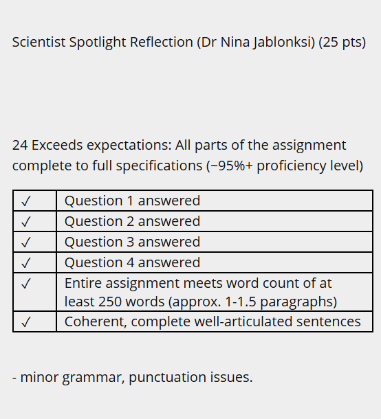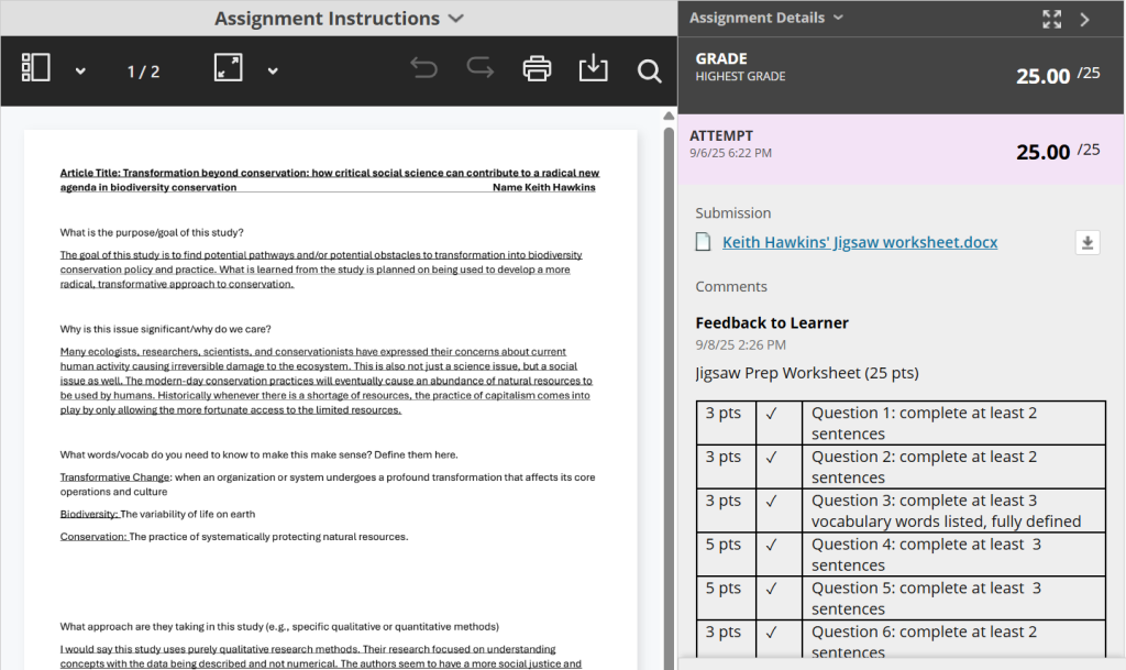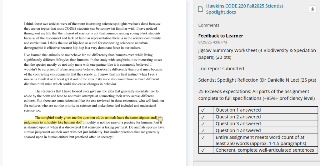 The artifacts above our screenshots of grade reports on scientist spotlight reflections and jigsaw worksheets. I received an 100% proficiency grade on all of them. While completing these assignments I learned about different aspects of research methods and the importance of biodiversity and conservation. In jigsaw assignments we annotate research articles to trade information with other students who read different research articles. These practices helped me improve my written communication skills by pushing me to pay attention to how I relay information on paper.