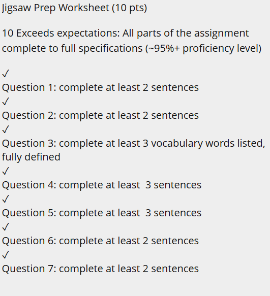| (25%) Based on (1A) Civic Engagement: Demonstrates ability and commitment to collaboratively work across and within community contexts and structures. | * Communicate and collaborate effectively in jigsaw work group. * Physically attend class at a high rate | Show all jigsaw papers done in class over the semester | *Jigsaw papers displayed should meet all writing requirements and score 80%. * I should have at least a 90% attendance rate . |