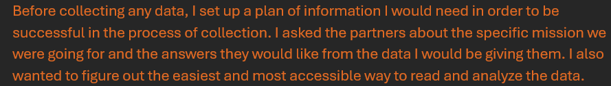 In my data collection process, I made sure to allow my data was accessible to me and therefore others while meeting the needs of the community partners.
