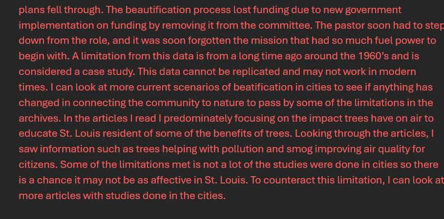 In my data collection I connected the previous found communities of St. Louis to improve the community as a whole to how we can implement those ideas to Heartlands with their plans to plant more trees in the St. Louis Area.