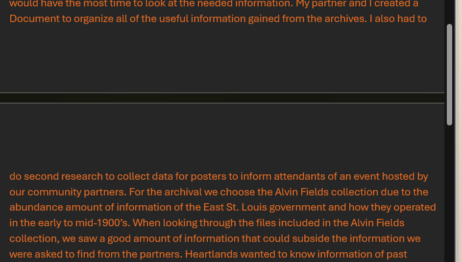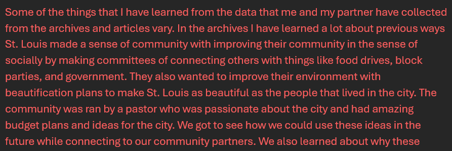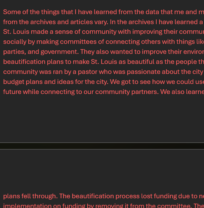 In my reading of the archives, I connected the information I gained from previous communities in the papers above to possible ways our community partners can gain interest from the residents of east St. Louis like what was done in the past.