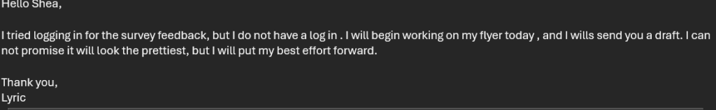 In this email I communicated my issue with completing my task given to me by Shea. I informed Shea of my concerns about the appearance of my poster due to me not having the best artistic ability, but I will try my best.