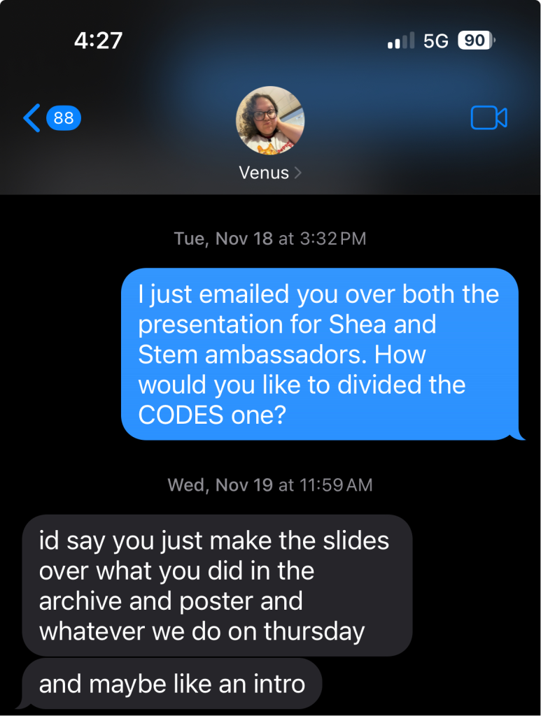 In this text message I made an invocative to start and divide work assigned for our CODES class. I also informed my teammate of our process and steps we should do in the future clearly.
