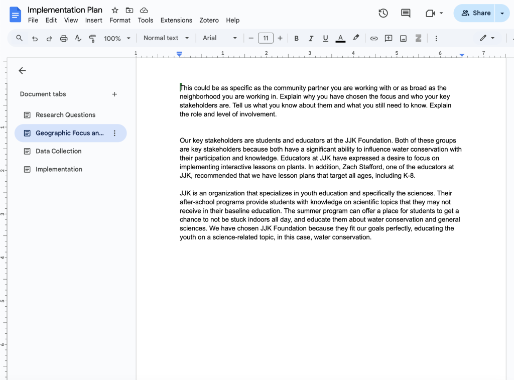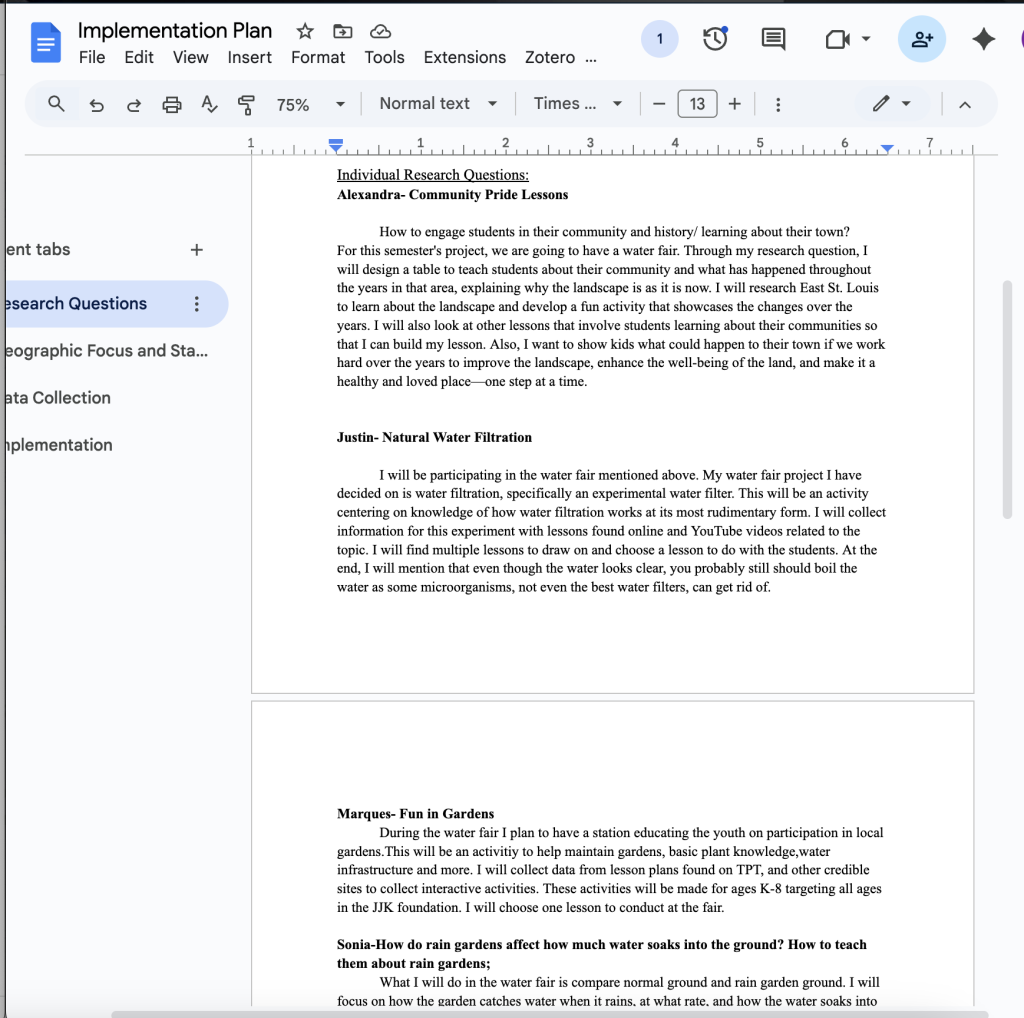 In this artifact I explain the key stakeholders in our our implementation which is our students. My research on water conservation and curriculm helped me develop my response