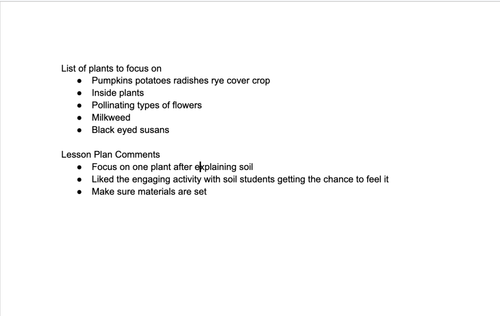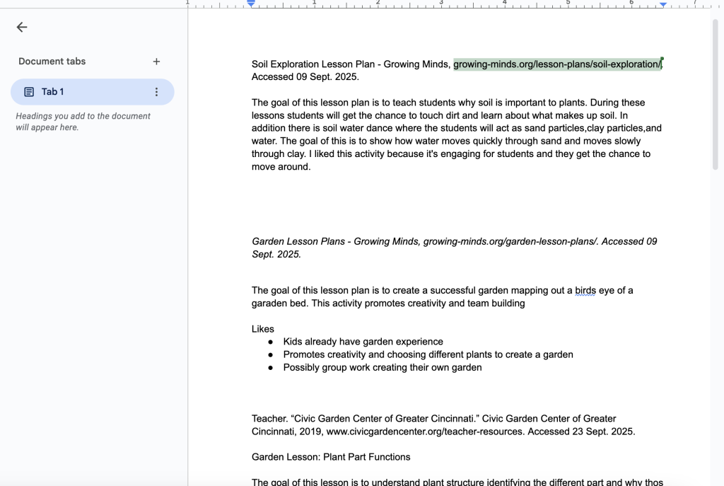 | -Researching from credible websites -citing sources correctly | -reflection 3 -Notes on plants for lesson -annotated Bib | -information is well formatted and organized -All sources are cited and credible |