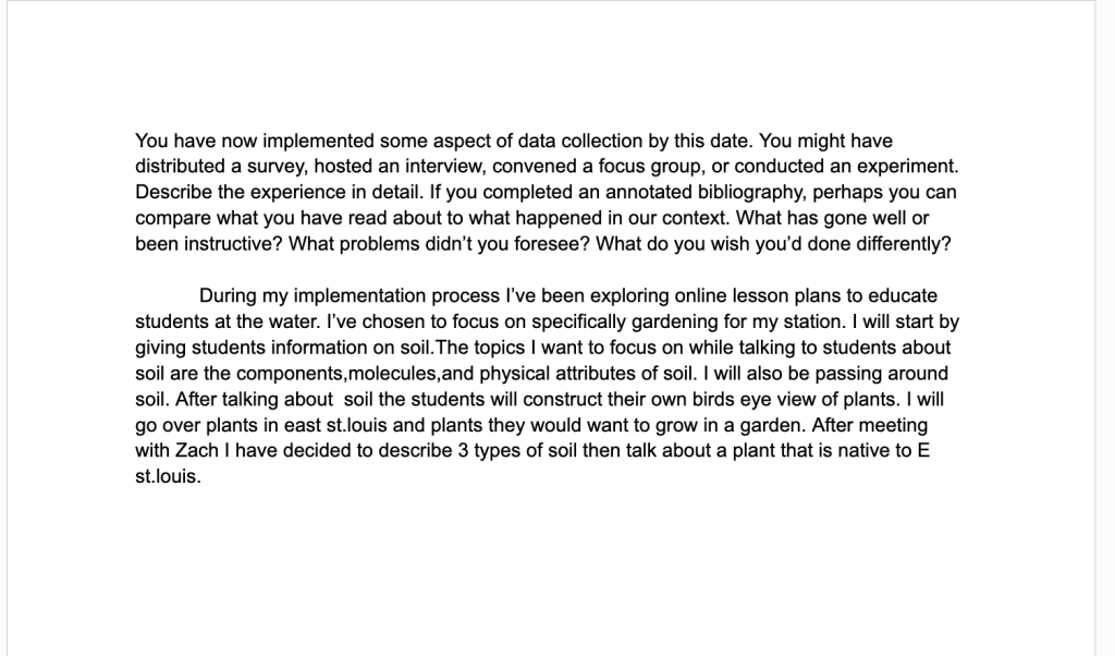 During this semester I enjoyed getting the chance to research so many fun ways to educate kids on science, it allowed me to to see science education from a different perspective. The goal I excelled at the most is goal 7a because of the research I’ve done. I’ve researched many different lesson plans that have allowed me to compile my own lesson to teach the youth about the importance of soil. In the second half of the class I plan to focus on my presentation due to that being a major of the rest of the semester, I will be demonstrating after I have learned after the water fair and how it has impacted the kids at JJK.