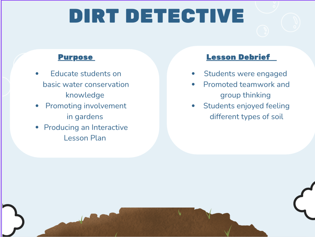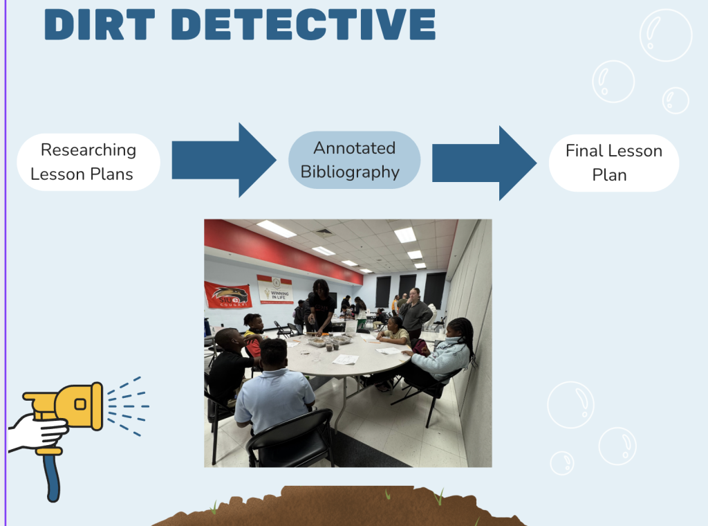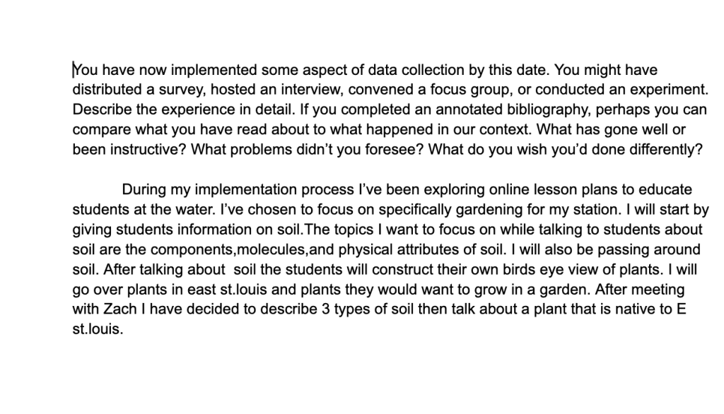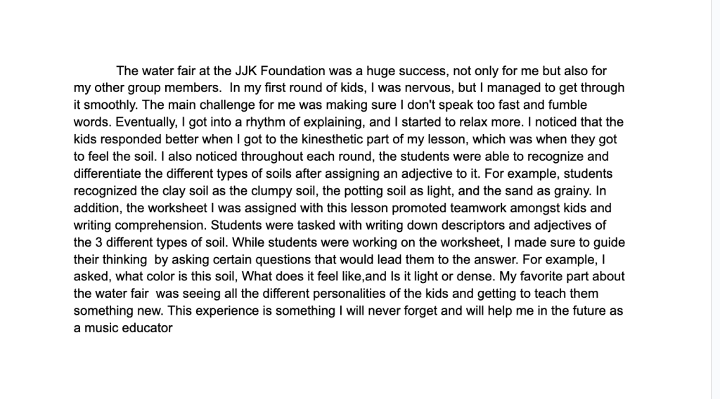 During this semester I enjoyed getting th chance t research so amny fun ways to educate kids on science, it allowed me to to see science education from a different perspective. The goal I excelled at the most is goal 7a because of the research I’ve done. I’ve researched many different lesson plans that have allowed to compile my own lesson to teach the youth about the importance of soil. In the second half of the class I plan to focus on my presentation due to that being a major of the rest of the semester, I will be demonstrating after I have learned after the water fair and how it has impacted the kids at JJK.