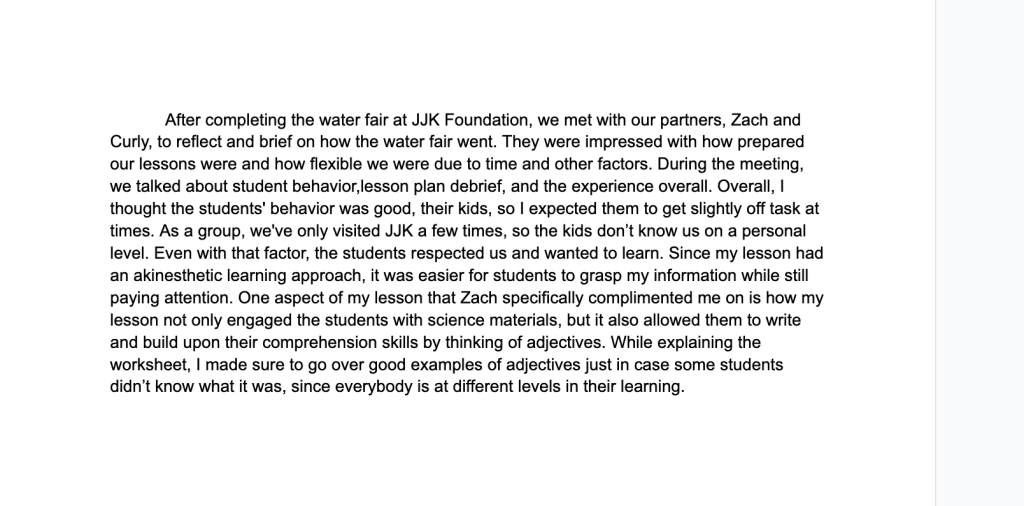 I met most of my goals this semester, specifically goal 7a exploring a topic in depth. During the semester we were tasked with creating our replicating a lesson at the JJK foundation and I chose to create my own lesson plan after researching and creating my annotated bibliography. Earlier in the semester I was suprised by the amount of time we were given to research and ind our lesson plans but I realized weeks later how much planning and research goes into planning a water fair. This experience has given me more insight into how I should be lesson planing for classes in the future and how mcuh attention to detail I need to have as an educator. One skill I would like to take with me into my next classes is 1c. This goal important for me because having good communication in a team is important and it allows for more productive class time and use of time overall. This has been one of the best group assignment I’ve had and I plan to take these skills with me into my career and future classes