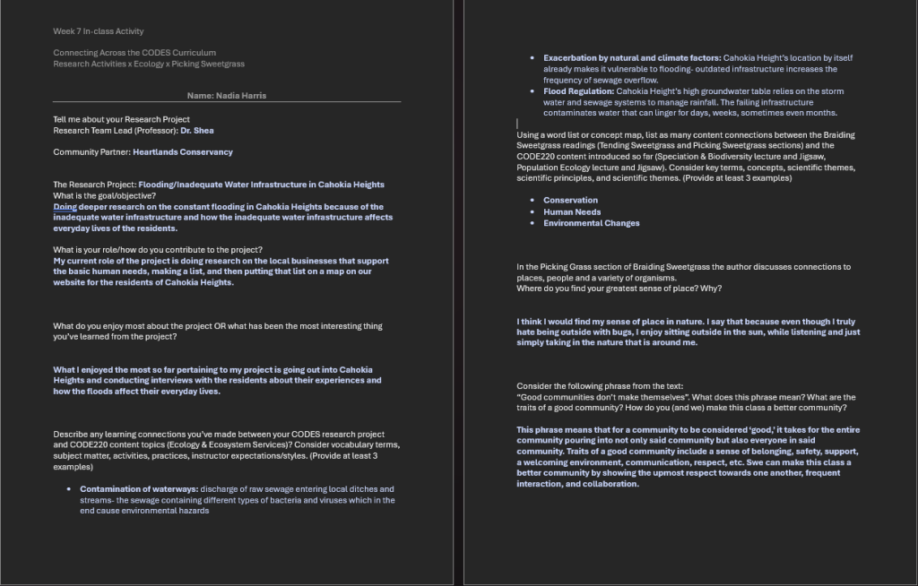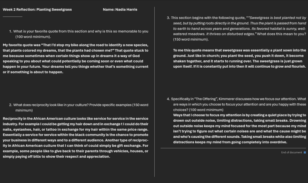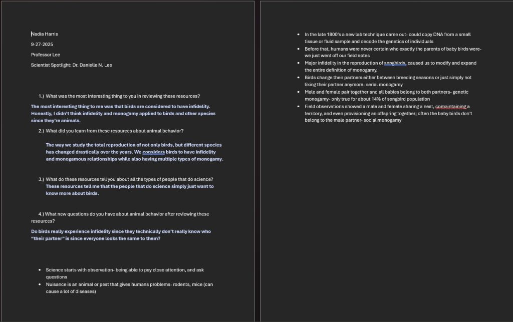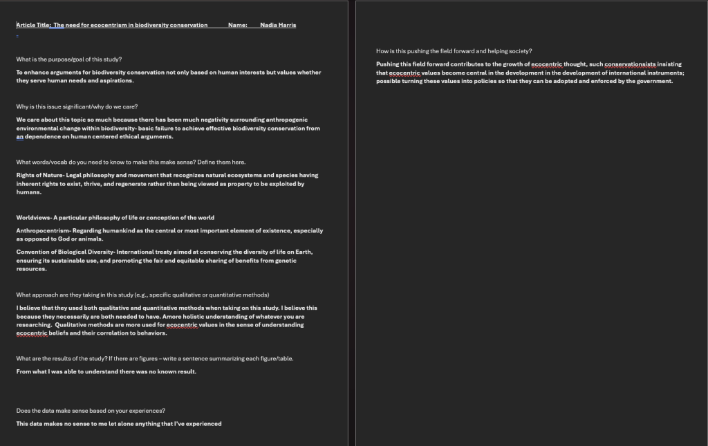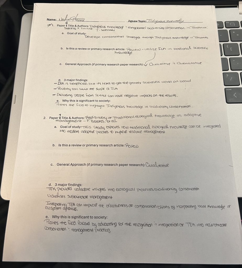 | I will engage in class lectures and analyze various sources of data for the research report | – Research Report – Class Participation -In-class assignments -sciencetist spotlight -Full jigsaw assignments | Notice that I am more comfortable with speaking out loud. I will be more confident within myself. |