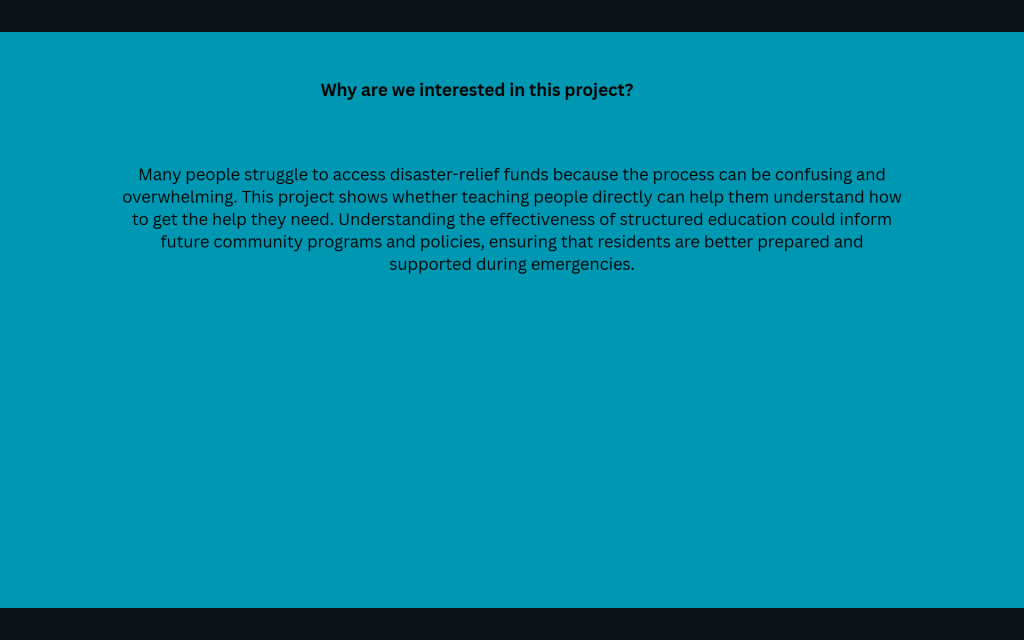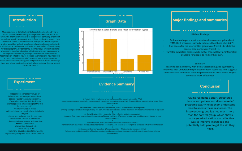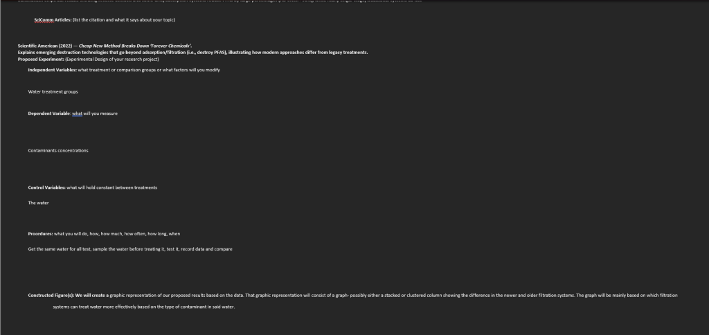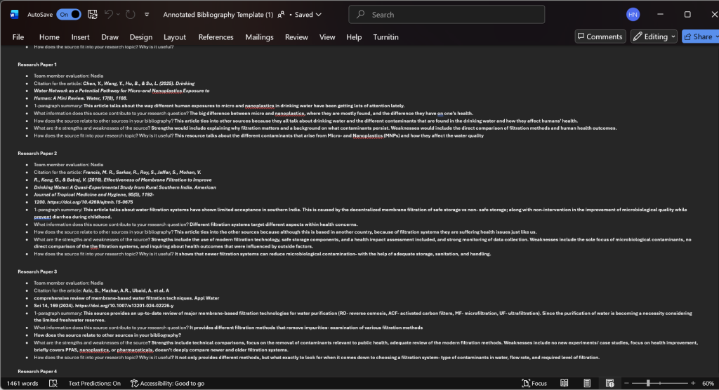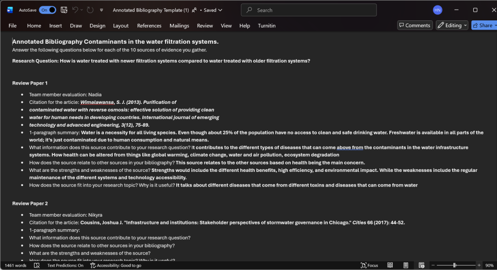 | Focus solely on class lectures on course content to learn how to solve problems Using different problem-solving skills from different classes. | -Finding a plausible solution to our research problem -Annotated Bibliography -Poster Presentation -Reflections -In-class assignments | My group’s work will be well structured, and done in an efficient manner. I will be less stressed and more confident within myself. |