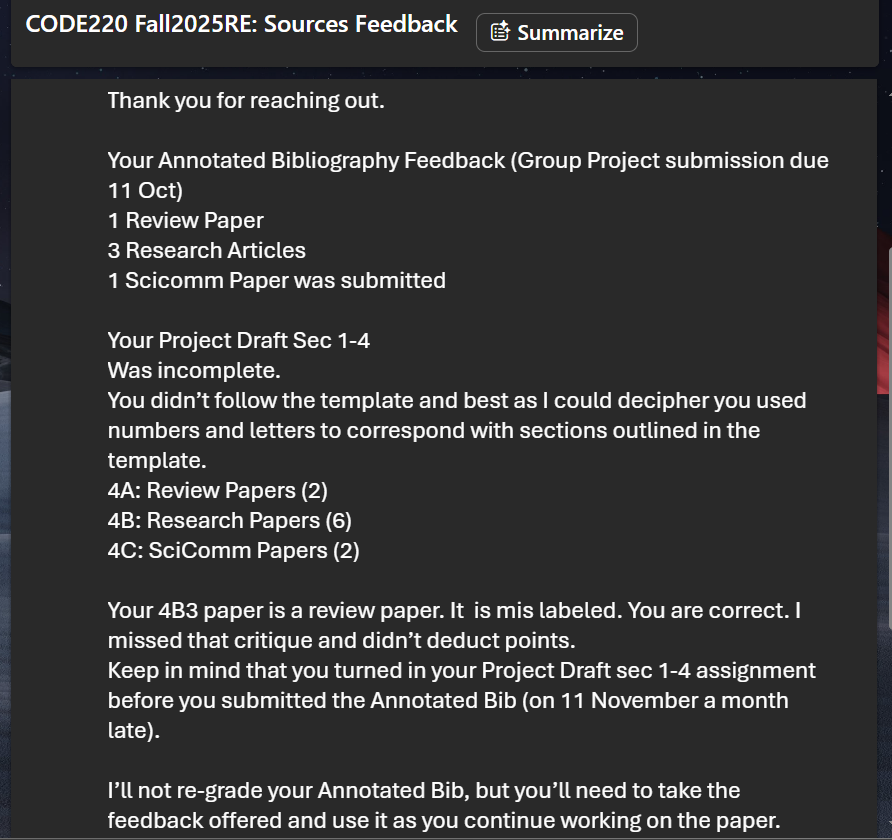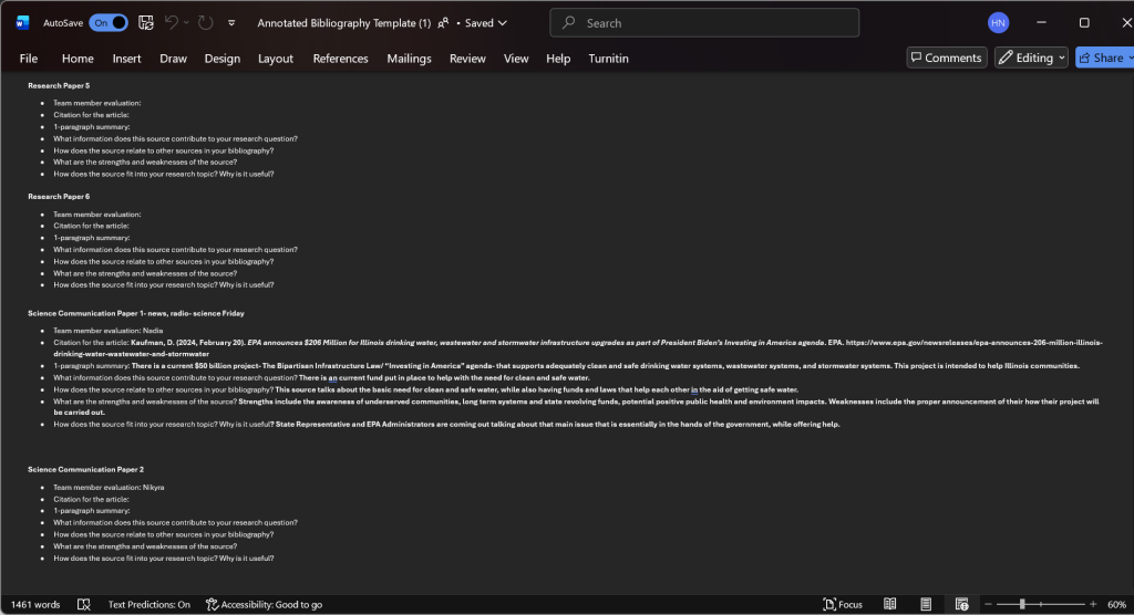 | I will be fully engage in both readings and class discussions Come prepared for class discussions | -2/3 reflections -Research report -In-class assignments -Jigsaw Prep Assignments -Annotated Bibliography -Scientist spotlights | * Attending and participating in class discussions * Will be prepared for class sessions. * Work will be done in a timely manner |