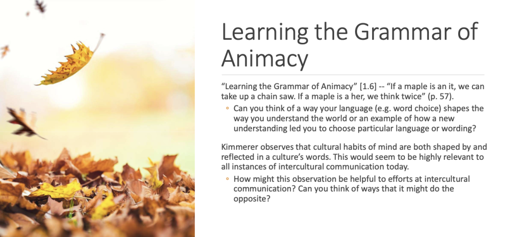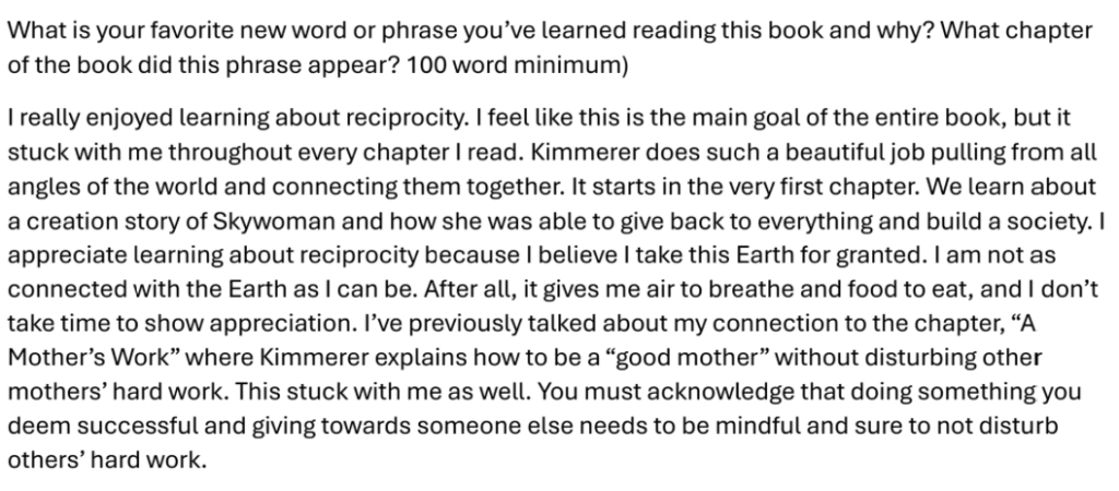 Below is part of my favorite Braiding Sweetgrass reflection. This, along with all other Braiding Sweetgrass reflections, received full points and were very helpful for participating in class discussions.