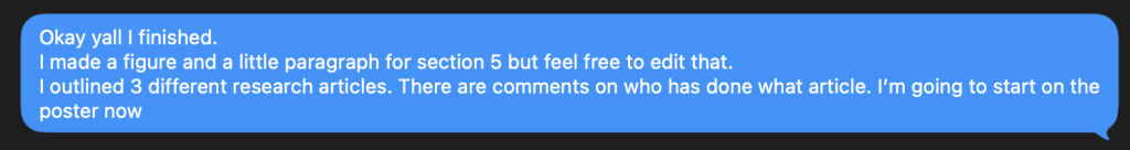 Lastly, below you will find text messages sent from myself to my group, wanting feedback on section 4 of our final research paper. This proves that I was willing to accept feedback to better my part of the project.