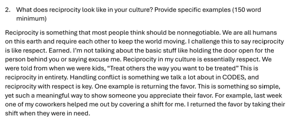 Below is a snapshot of part of a Braiding Sweetgrass reflection. Here I analyze my contribution to the Earth and themes of reciprocity. This shows my understanding of political and cultural issues connected to class material.