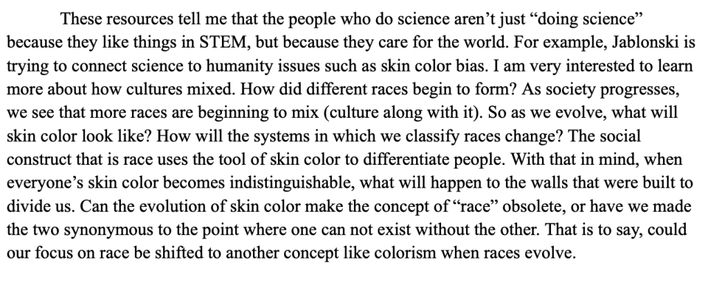 Below is the final paragraph of a Scientist Spotlight highlighting skin color bias. I am very proud of this conclusion, not only because skin color bias fascinates me, but also because it made me think harder. I was able to ask many follow up questions that got me thinking about our future.