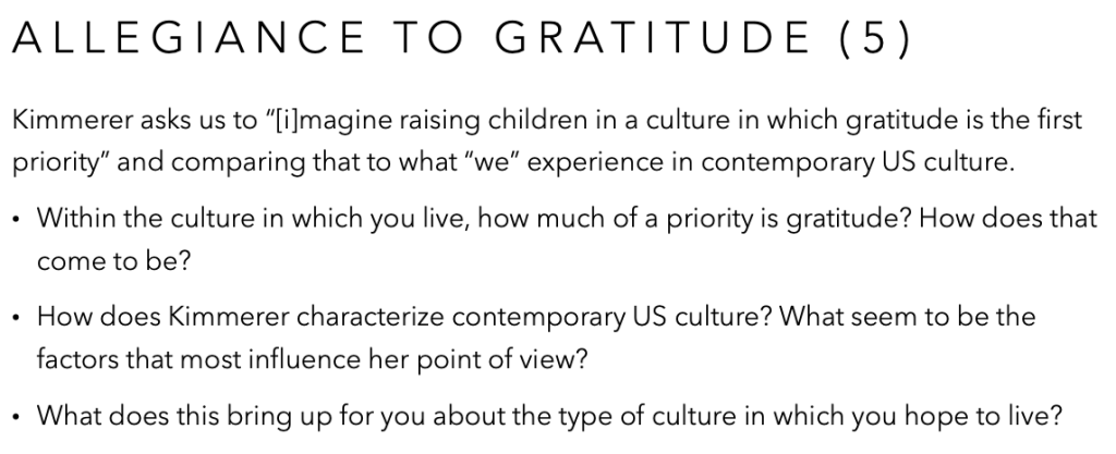 In our small groups, we discussed the desire to recite this allegiance instead of the Pledge of Allegiance every morning. We decided we would rather show gratitude to our Earth than to our government.