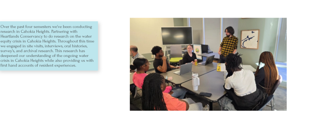 The overall purpose of the project is to gain exposure to the community of Cahokia Heights who are dealing with a water equity crisis that creates issues in a variety of domains such as residency, access to healthy foods, and public health.