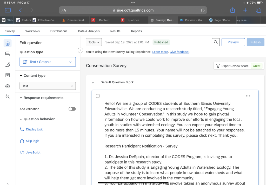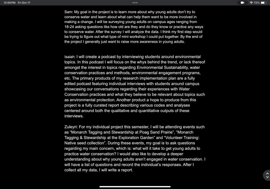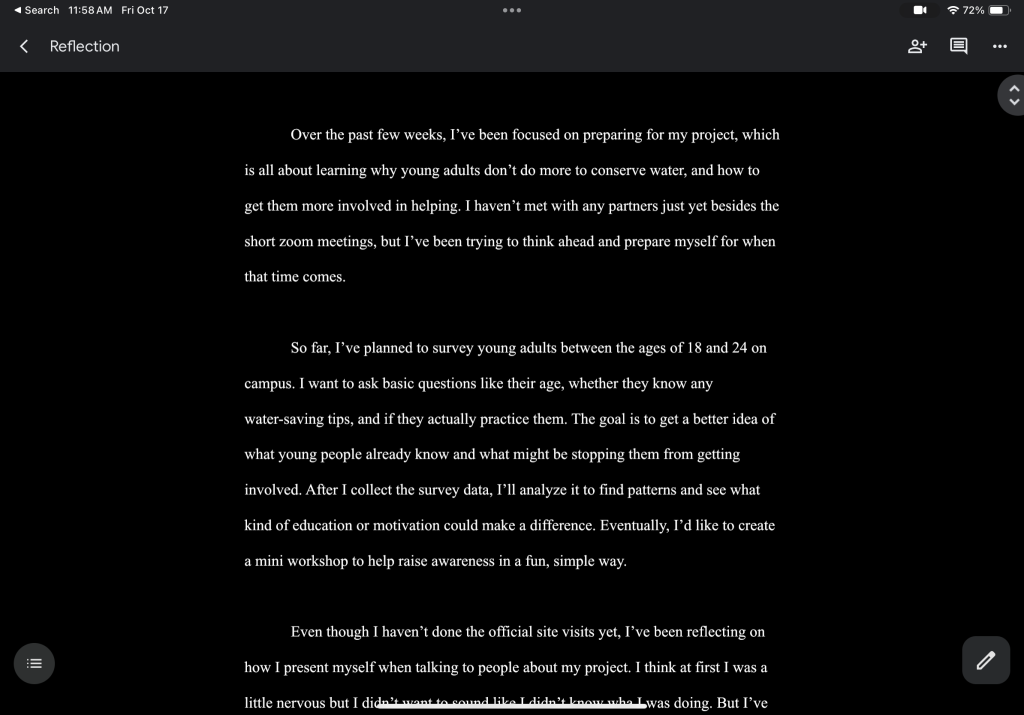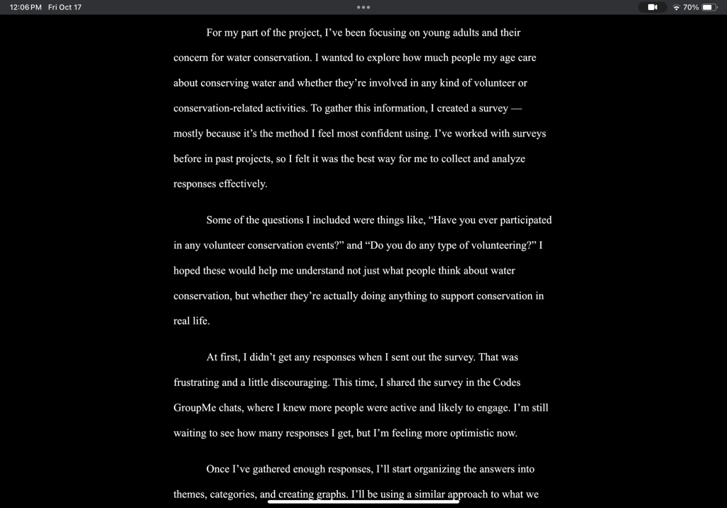 What I’ve enjoyed most so far is getting to focus on a topic that feels meaningful — young adults and water conservation. It’s been interesting to see how people around my age engage (or don’t engage) with environmental issues. I like that this project gives me a chance to connect what we’re learning in class to real-world behavior.