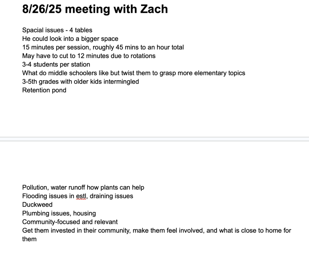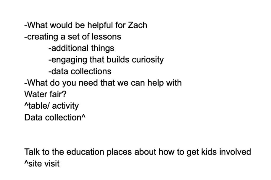 These are meeting notes that my group and I have while we met with Zach. These notes gave us a better idea on what to takeaway from our meeting, and helped us progress our project.