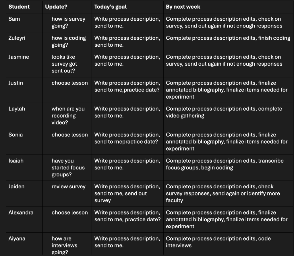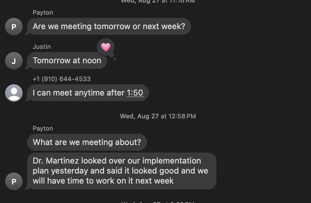 This is a screenshot of texts from my group planning to meet so we can be on track in and out of class. Meetings/ check ins are extremely helpful because they give team members the opportunity to ask for help and feedback.